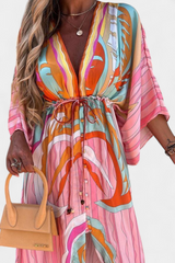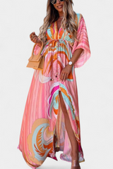 Una explosión de color para días donde la libertad es el mejor estilo. El vestido Joelle combina un vibrante estampado arcoíris con una silueta holgada y fluida que envuelve con frescura. Su escote en V y mangas murciélago añaden movimiento y elegancia sin esfuerzo.