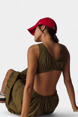 - Detalles: Escote barco, espalda abierta, bolsillos inclinados + cargo, cierre frontal