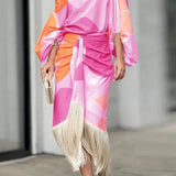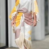Gracias a su tejido de algodón y poliéster, es suave al tacto y resistente; además de ser fresco, lo que lo hace perfecto para usarlo en las próxima temporada. Su corte holgado y su diseño se adaptan a la perfección a ti, por lo que garantiza un ajuste excepcional a cualquier figura. Sus mangas de murciélago abullonadas junto con su falda de flecos y su lazada al frente le brindan un toque moderno y a la vez de elegancia. Triunfarás allá donde vayas.
