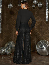 - Mono con lentejuelas: Los pantalones aportan un brillo espectacular que capta todas las miradas.
